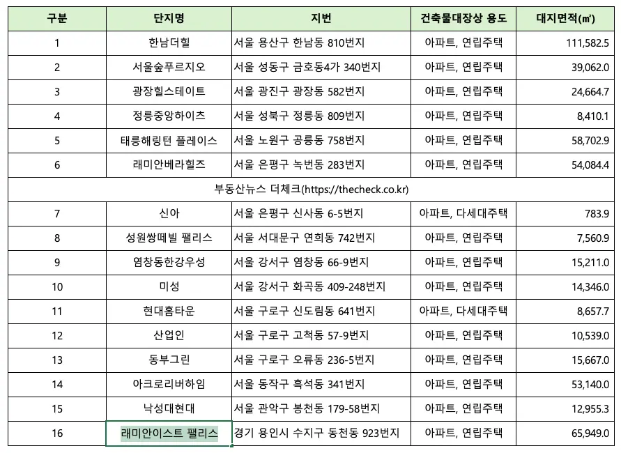 | 4 | 정릉중앙하이츠 | 서울 성북구 정릉동 809번지 | 아파트, 연립주택 | 8,410.1 |